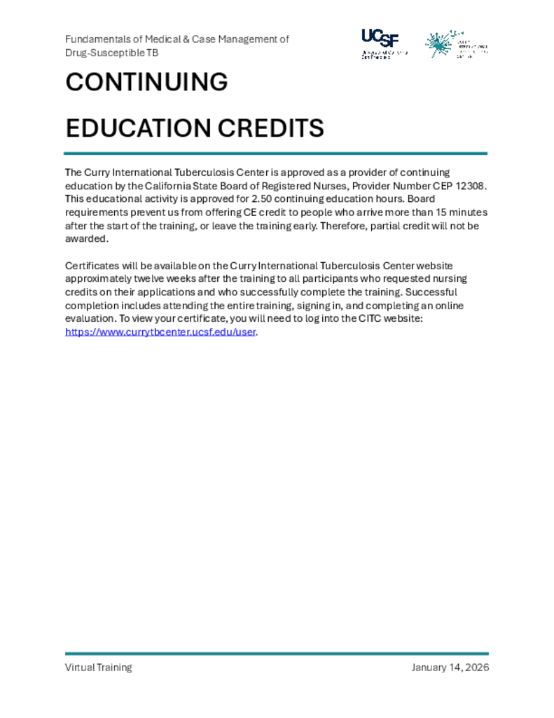 The Curry International Tuberculosis Center is approved as a provider of continuing education by the California State Board of Registered Nurses, Provider Number CEP 12308. This training is approved for up to 2.50 continuing education hour. Board requirements prevent us from offering CE credit to people who arrive more than 15 minutes after the start of the training, or leave the training early. Therefore, partial credit will not be awarded.