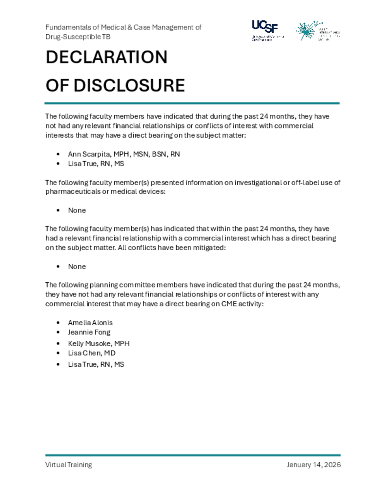 This virtual training is part of the Curry Center’s Tuberculosis Case Management and Contact Investigation Intensive (CMCI) core training. The virtual CMCI series is designed for tuberculosis case managers and public health nurses who deliver case management services to patients with active or latent TB within the public health setting. For more information about this series, and other core training opportunities, please visit our website or email us at CurryTBCenter@ucsf.edu.